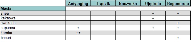 Masło Cupuacu – Natłuszcza, nawilża, uelastycznia i ochrania skórę przed promieniowaniem UV. Ma działanie regenerujące i przeciwzapalne. Zawiera przeciwutleniacze neutralizujące działanie wolnych rodników. Łatwo tolerowane i nie powoduje alergii kontaktowej. Twardość podobna do masła shea, zapach-różny: podobno marcepanowy (nie trafiłam na takie jeszcze), neutralny-ledwo wyczuwalny lub bardzo mocny dla mnie dość nieprzyjemny zgniły zapach – nie do ukrycia w gotowych kremach. Trzeba o to pytać przed zakupem.